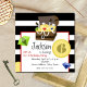 A pirate themed birthday invitation featuring a black and white striped background. Illustration of a treasure chest filled with gold coins, pearls, swords, and red, green and blue jewels at top. Coins and jewels scattered over invite. Personalize the text and the number on the coin.