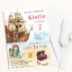 A pirate and mermaid ocean themed kid's Birthday invitation. The watercolor design features a pirate ship on the sea sailing towards a treasure chest, while a mermaid is seen in the sea and sitting on the shore. Personalise by editing the digital or printed invitation with your details.
