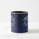 Mug featuring the zodiac symbol for Pisces in soft silver blue, overlaid with the stars of the constellation, against a starry sky background graded from deep midnight blue to black