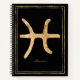 Stylised hammered gold Pisces astrology zodiac birthday symbol in a hand drawn gold double line frame. A hardcover or softcover notebook with your choice of inside pages. Choose from sketchbook, bullet journal, checklist, graph paper, recipe book, or lines in various widths and colours. Customisable. Aquarius text in a fine script on the front cover can be personalised, text can also be added on the back.