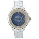 Watch featuring the sun sign for Pisces in soft silver blue, overlaid with the stars of the constellation, against a dark blue, starry sky background