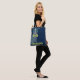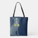 This custom tote bag features an illustration of a handsome pup. This dapper dog is wearing a pair of teal coloured glasses and a lime green bow tie and is set against a navy blue background. At the bottom of the pit bull puppy graphic is a spot to add a name in coordinating lime green letters.
