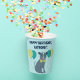 Throw a paw-some dog-themed birthday party with these personalised party supplies. These paper cups are ready to be customised with your message and feature an illustration of a pit bull puppy wearing glasses and a bow tie surrounded by party balloons.