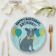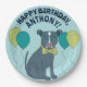 Throw a paw-some dog-themed birthday party with these personalised party supplies. These paper plates are ready to be customised with your message and feature an illustration of a pit bull puppy wearing glasses and a bow tie surrounded by party balloons.