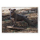 This card says, "Welcome Home." Inside it says, "Now, LET'S PLAY!" An adorable card showing a handsome Blue Nose Pitbull named Sarge. Sarge is standing with his two front paws on his favourite toy, a skateboard. His hind legs are extended and his ears are high and alert as this handsome dog looks at you in a perfect pose.