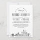 It features a modern deco-style illustration of the city's skyline resting towards the bottom. Centred above this are the names of the wedding couple and your wedding day information in matching open-lined style text. The text elements of this are framed by a square line border enveloping it. This is all together presented in a neutral black and white, classic colour theme.