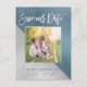 PixDezines modern geometric shapes with DIY colours in platinum silver and slate blue save the date postcards with faux foil in platinum and silver confetti and fun modern calligraphy script. DIY background colour. Customise it!