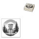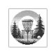 An ai illustration of a disc golf course with basket, pine trees and sunset in an 8-bit pixel art gaming vibes style.