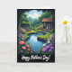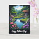 This card shows a pixel-style garden scene with a gently curving stream in deep blue, catching tiny light flecks as it winds through bright green grass edged with small grey stones. Along both banks, dense flowers in pink, purple, and white cluster together, and the way they lean towards the water feels like a quiet, caring gesture ❤️. In the midground, an open-sided shelter with a warm brown tiled roof and simple wooden posts sits near the stream, like a calm spot where someone might pause and share a soft smile 👩. Across the water, an aged stone wall runs behind the plants, partly covered in rich green ivy that drapes down in layered patches. The sky is pale blue with puffy, pixelated white clouds, and the overall lighting suggests a clear, gentle daytime glow. The message “Happy Mother’s Day!” appears in white lettering near the bottom, standing out against the darker framing border and the greenery behind it. Dark borders surround the scene, and the stream’s blue path leads the eye towards the little shelter and the ivy-covered wall.