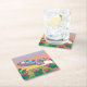 This coaster features a charming pixel art image of a metallic silver spaceship landing in a field. The spaceship has a rounded design with visible panel lines and a single, glowing blue porthole. The landing area is filled with whimsical cacti adorned with bright pink and yellow flowers, creating a cute and inviting scene. A soft gradient sunset of pastel oranges and purples fills the sky in the background, establishing a tranquil and pleasant atmosphere. The coaster is a square paper pulp coaster. The coaster set contains six coasters.