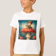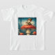 A t-shirt decorated with a cute pixie and a kitten sitting on a mushroom