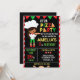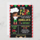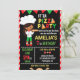 Cute invitation for young chef's birthday party featuring pizzas, dark skinned girl chef and some cooking equipment.