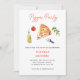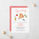 Cute Pizza Birthday party invitation featuring Watercolor pizza, olive oil bottle & tomato.