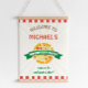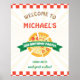 Grab a slice! Welcome everyone to your pizza birthday party with pizza slice welcome sign template. This pizza birthday party sign features a slice of pizza with cream box background on a modern style sign design.