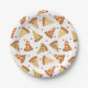 Retro style pizza slices with all the topping options and small red hearts on a white background paper plate.
