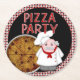 Pizza Party-is a digital graphic art design. Chef Italiano stands at the lower right corner. A pepperoni pizza on the pan sits just off to the left. Decorative red and white text reads: PIZZA PARTY. The centre background is black. The coaster border is an allover background checks pattern on angle of white, red and black squares. The inner rim is red and the outer rim is black. This design is available with assorted background and border colours. Coordinating invitations and party supplies is available.