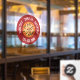 Round Pizza restaurant theme window cling decal sign template you can customise online with image of a pizza pie and the words Dine In, Takeout, Delivery, and a phone number. Promote your pizza parlour in a professionally designed budget friendly decal sign for your store windows or front door.