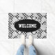 Cool black and white chequered welcome mat printed with hand drawn pizza slices and herbs. Perfect doormat for Italian restaurants, pizza parlours, trattorias and pizza chefs' homes