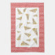 This custom kitchen dish towel or tea towel has slices of pizza all over it, on a white background. The border looks like a red chequered tablecloth. It reminds me of a pizzeria.