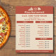 A flyer in beige and red brown tones with menu & price list for pizzeria, restaurant, food truck, home delivery food or cooking chef, illustrated with a slice of pizza, a chef's hat, and a building. You can distribute them to your customers or in mailboxes. Texts are fully customisable!