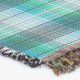 A quality printed throw has its advantages. This is a much finer weave throw than its loopier cousins, and though lighter, it is worth the investment for custom room accessorizing. The back is much prettier than the typical brown, and the fringe on the long sides very vivid, the selvage nicely done. Before photographing, I washed the throw in cold water, delicate, with a thicker woven throw the same size. On tumble dry low, this throw was dry in half the time as the other. This is a very practical quality if you use throws for furniture covers or to wrap up in frequently. The sleekness of the fabric makes it a great layer for accenting or protecting without the feeling of sitting on too much stuff. Perfect for napping or when you feel a light chill coming on. The color printing is beautiful and on this fabric, matched the design and color of my Photoshop image. This is an advantage for blending room fabrics and colors. The fringe on the short sides prints the colors from the design image and therefore varies from the side fringe. I streaked a white fractal line through the plaid pattern to give the illusion of weaving. This printed as crisp as an illusory thread, and put some white in the short side fringe, showing another advantage of print vs loomed- for artistic purposes, line lines, detail, and color integrity can be planned and preserved. My loomed throws have color limitations and more of a needlepoint texture. Print throws reproduce an exact image. The throw felt a little stiff straight out of the package, but this went away in the first delicate wash. Of course I searched the wash water for ink or bleeding and there was none.