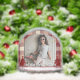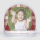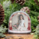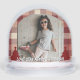 Burgundy red, plaid Christmas photos snow globe. Create a personalised gift for anyone. Upload two photos to the arch shaped templates, on each side. Create a short message, or add names, under the photos. Reddish-brown Christmas trees decorate each side.