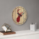 A clock with a rustic style. Designed with a deer head with antlers, made of red plaid. . An image of wood planks for the background give it an outdoorsy country feel.