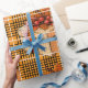 Make your Thanksgiving presents extra special with this unique gift wrap. Featuring cute gift box icons on a cosy orange and brown plaid background, this paper is perfect for the holiday season. Shop now!
