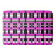 This bath mat features a modern twist on plaid in shades of pink, grey, black and white.