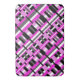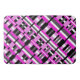 This bath mat features a modern twist on plaid in shades of pink, grey, black and white.