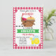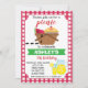 This picnic birthday invitation features a picnic basket, pie, watermelon and a jug of lemonade on a white frame with a red plaid pattern border. The design also features a green banner. This colourful picnic invitation is ideal for a summer picnic and all the text is edible making it suitable for various occasions. This picnic birthday invitation is ready to be personalised.