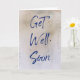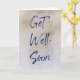 This get well card features bold blue handwriting style lettering that spells out the message "Get Well Soon" on the front against a textured tan colored background. Blue lettering on the inside of this card is ready to be customized with your own special message.