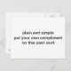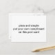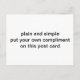 plain and simple put your own compliment on this postcard, is a nice way to say hello to a dear friend. Dont forget to purchase this plain and simple post card today.