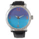 A very plain big faced watch with varigated blue face, Red Numerals. Classic in style,this watch will never date.Three hand quartz movement ,and genuine leather strap.