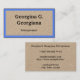 This plain business card design features a name, profession and contact info that can be customised. It also features a blue coloured border. Business cards such as these might be used by a professional such as a consultant, a doctor, or a manager.