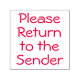 This minimalist rubber stamp design features the message "Please Return to the Sender". It could be used to indicate that received letter mail has been delivered to the wrong address or to an unknown recipient, and should be returned to the sender.