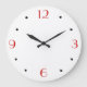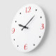 A very plain white round clock with Red Roman Numerals. Black clock hands and dots for other marker times.This clock can be customised to change size and colour. Available also in square form.