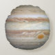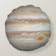 The planet Jupiter in a watercolor styling on a round pillow. The pillow is the same on both sides showing Jupiter's iconic red spot. The design is not photorealistic and instead is smoothed as if painted, complimenting the swirling clouds of the gas giant.