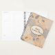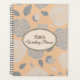 This planner notebook is shown with a petite silver-grey rose floral print on a soft Peach background. Personalised name for you to customise to yours inside a ivory oval with dual coordinating coloured borders of custom green and driftwood grey on the front. Back same colour and rose floral print. Text is rich brown.