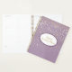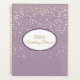 This planner notebook is shown with a petite Champagne stars print on a Sugared Plum coloured background. Personalised name for you to customise to yours inside a white oval with dual coordinating coloured borders on the front of dark Amethyst and warm orchid, matte gold text. Back same colour and stars print.