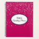 This planner notebook is shown with a petite silver-grey stars print on a bright Magenta background. Personalised name for you to customise to yours inside a White oval with dual coordinating coloured borders of black and cornflower blue on the front. Back same colour and stars print. Text is shown in Black.