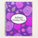 This planner notebook is shown with a rose floral print and background of bright purples and a mix of coordinating colours. Personalised name for you to customise to yours inside a white oval with dual coordianting coloured borders on the front. Back same colour and floral print.