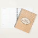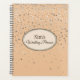 This planner notebook is shown with a petite silver-grey stars print on a soft Peach background. Personalised name for you to customise to yours inside a ivory oval with dual coordinating coloured borders of custom green and driftwood grey on the front. Back same colour and stars print. Text is rich brown.