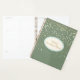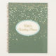 This planner notebook is shown with a petite Champagne stars print on a willow green coloured background. Personalised name for you to customise to yours inside an Ivory oval with dual coordinating coloured borders on the front of light tropical blue and ivory, matte gold text. Back same colour and stars print.