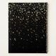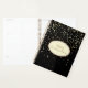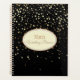 This planner notebook is shown with golden-champagne petite stars print on a black background. Personalised name for you to customise to yours inside an ivory oval with dual coordinating coloured borders of golden and silver-grey on the front. Back same colour and petite stars print. Text is in golden and champagne. Select your binder spiral on the side, this one is shown with gold.