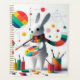 Discover a cute magical world where art comes to life with our charming 3D white rabbit graphic! This adorable bunny holds a paintbrush and a colourful palette, adorned with a long rainbow scarf around its neck. Surrounding the rabbit are various painting accessories like crayons and brushes, all in vibrant hues matching the rabbit's scarf. Set against a vintage white background, this enchanting scene is featured on a planner, ready to inspire your creativity every day!