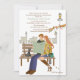 Invite family and friends to a rehearsal dinner celebration with this adorable design. The young couple is sitting on a bench looking over a newspaper while a little cat watches in curiosity. Little details such as a street lantern, falling leaves and a town skyline add to the charm.