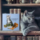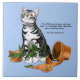 A silver tabby cat has knocked down and broken two plants in terra cotta planters in backdrop of blue