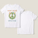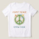 This t-shirt features a vibrant green peace symbol blooming with vines, flowers, and butterflies.