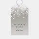 Chic hang tags for your business feature classic black lettering on a silvery grey background adorned with a burst of white bokeh lights at the top. Customise with two lines of custom text beneath. Backs are solid white for your additional custom text or handwritten message.